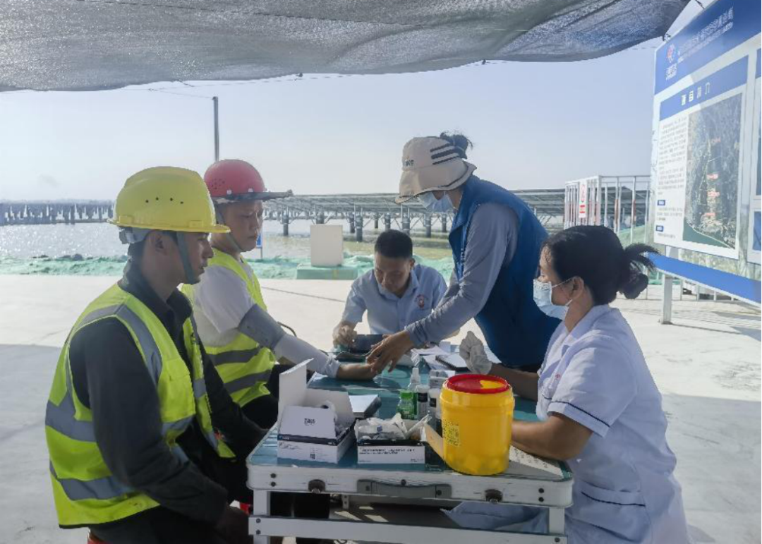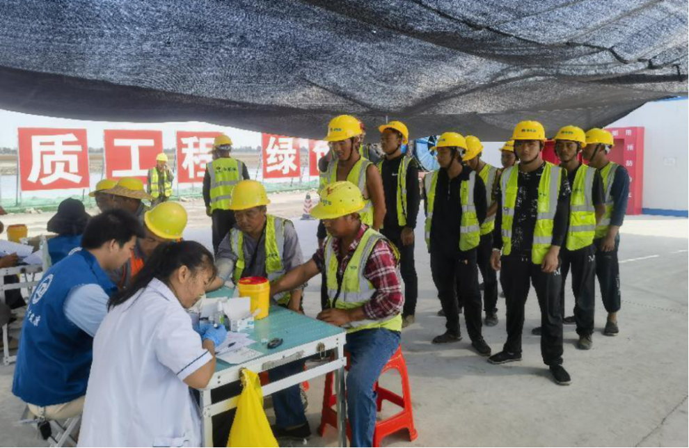 此次体检包括血压、血糖、乙肝抗原检测等内容,医护人员仔细询问工友的身体状况,逐一给出专业建议,同时还科普了防暑降温和暑期防病的健康知识。此次体检活动得到了工友们的一致好评,进一步增强了工友的健康防护意识,提高工友的归属感和幸福感,为项目建设筑牢“健康墙”。