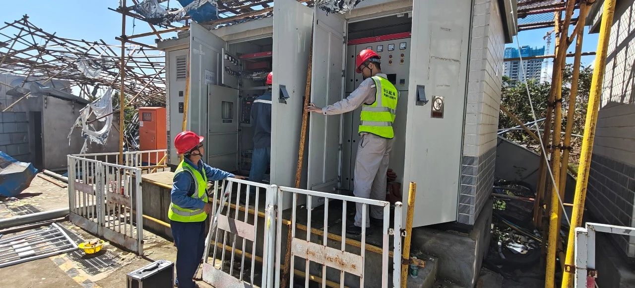 在海口江东区域和风家园5号地块项目,应急抢修队伍及时抢修恢复受损箱变。通过1天的不懈奋战,抢修队伍充分发挥吃苦耐劳、连续作战的精神,顺利完成了项目3台临电箱变的维修工作,确保箱变具备送电条件,保障项目尽快实现复工复产。