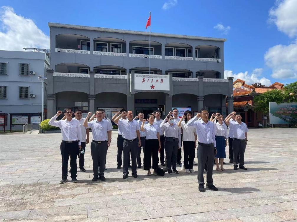 在琼海市椰子寨战斗遗址纪念馆,在讲解员的带领下,通过“听、学、看”,深入了解椰子寨琼崖人民“孤岛奋战、艰苦卓越,二十三年红旗不倒”的战斗历程,感悟共产党人坚定不移的理想信念和舍生忘死、不怕牺牲的崇高精神。参观中,大家或驻足深思、或讨论交流、或虚心请教,用心用情体悟中国共产党历经磨难、坚毅前行的伟大精神,感受椰子寨村的发展变化。忆古思今,如今的椰子寨村以红色文化底蕴为依托,将红色历史主题与美丽乡村建设相结合,已成为革命传统教育、发展红色旅游、乡村旅游及实施乡村振兴战略的样板典范。 “我志愿加入中国共产党,拥护党的纲领...随时准备为党和人民牺牲一切,永不叛党...”,在吴敏同志带领下,全体党员庄严宣誓,铿锵的誓言在纪念广场激昂回荡。